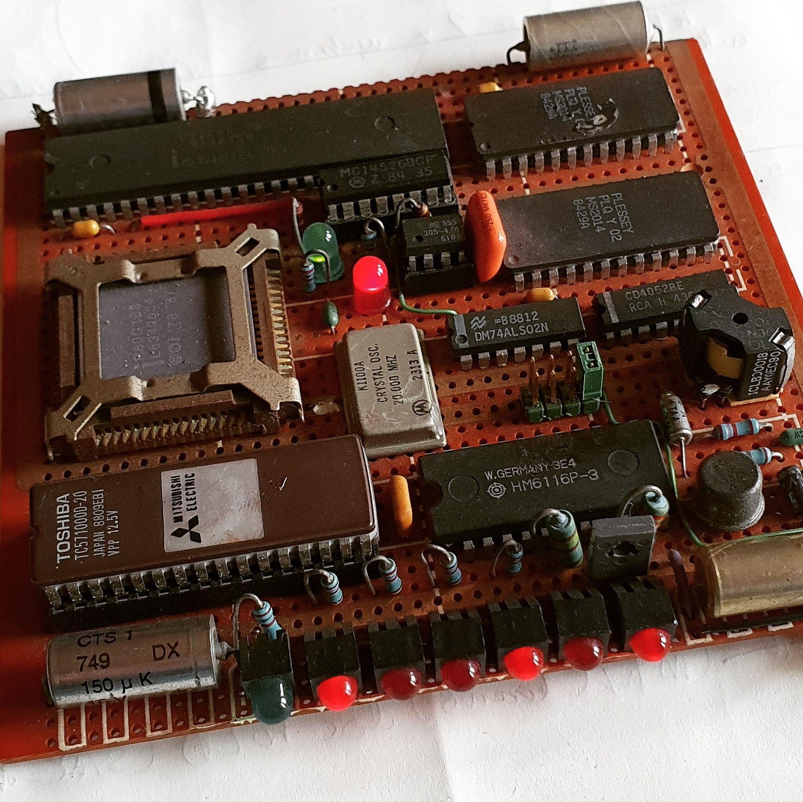 Just dug this out of storage – some electronics I made in the late 80s/early 90s. Most of it is old/scrap components that were lying around on my desk – only the (socketed) 555 and MC14526 counter/divider actually do anything; flashing the LEDs along the edge. I can remember making it at work during quiet times as a side project, I had no idea why or what it might be good for… 🙂