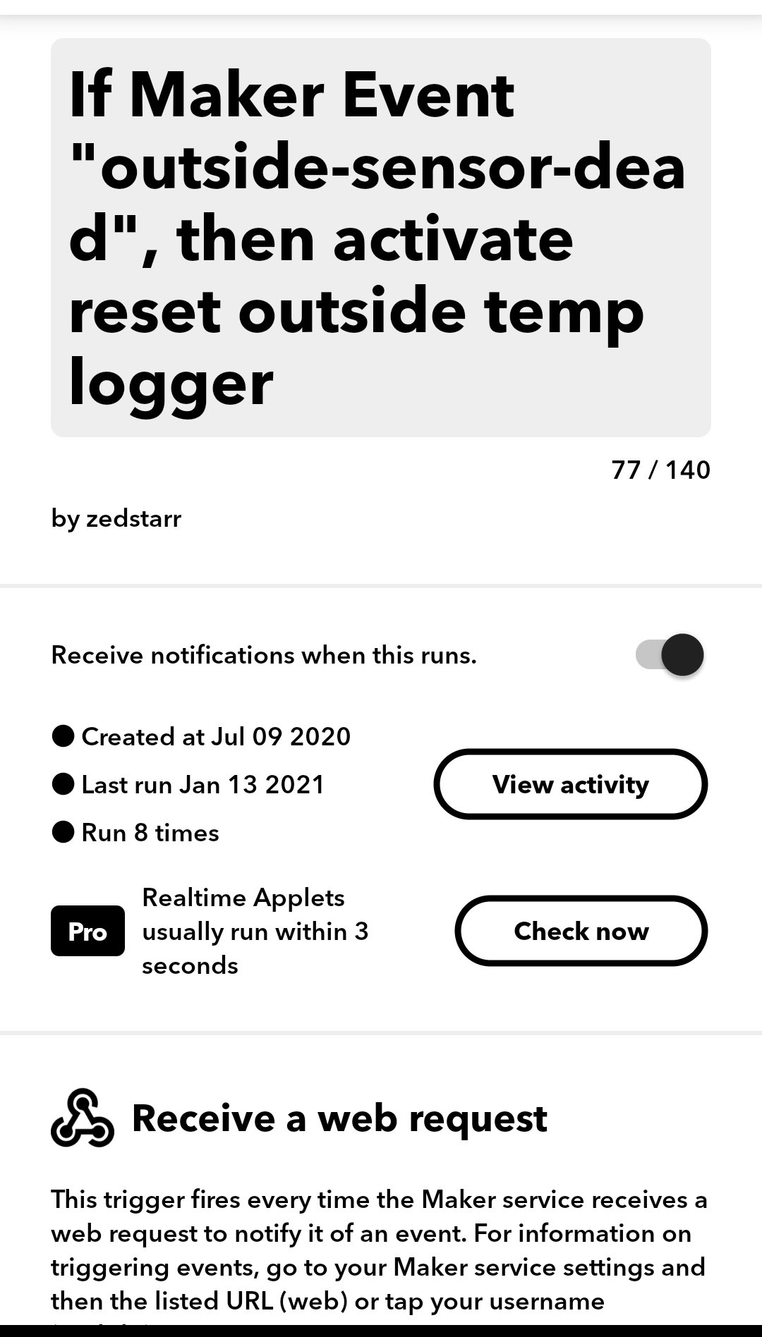 Turns out the cheap DS18B20 sensors I’d bought from Amazon have a nasty habit of locking up, and rebooting the Pi isn’t enough to bring them back to life – the Pi has to be re-powered. Luckily I had a few spare remote control mains switches that knew I could control from IFTTT so I set up a bash script on each Pi to monitor the sensor and when it locks up I call an IFTTT action via the webhooks service then shut-down the Pi. The IFTTT action would call a “scene” on the smart sockets app that would wait 40s (for Pi to shutdown cleanly), turn off the socket, wait 20s then turn the socket back on. A real nasty workaround for some cheap sensors but so far it’s worked like a dream 🙂 I later bought some (much more expensive) DS18B20 sensors from a reputable source but haven’t got round to replacing all the cheapo ones just yet…