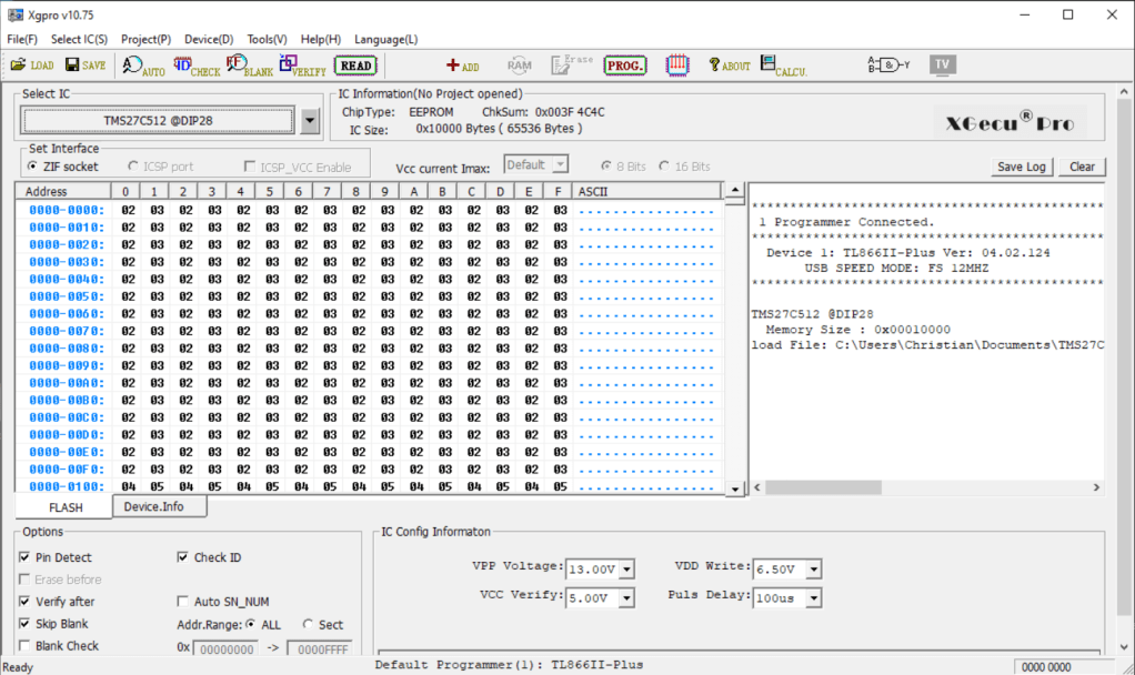 Back to the 5V ROM vs. the 3.3V Pi – “Datasheet says NO!” – minimum Vcc is apparently 4.5V… hmmm. To satisfy my curiosity I gave in and purchased a USB EPROM programmer (the TL866IIplus) and imaged the chip again. Looks like reading the 27C family slowly at 3V3 is viable as the image from the Pi and the USB reader are identical: