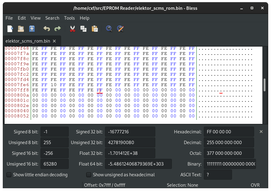 I wasn’t sure of the data integrity as the 27C512 is a 5V part and the Raspberry Pi’s GPIO is all 3V3 (and not 5V tolerant) and I had powered the ROM from 3V3 too. In the python script I’d inserted pauses of 1ms after setting the address/OE/CE before reading the data bus. Looking at the contents of my binary image it looks mostly sensible: it’s easier to judge by eye with this particular ROM due to its function as a finite state machine (FSM), it’s not just “random” binary data (like executable code might appear). There are some anomalies to the repeating patterns though: e.g. 0x7FE8 in the image above and a few other locations I’ve spotted too. I can’t say for definite at the moment if they are corrupt locations or good data.