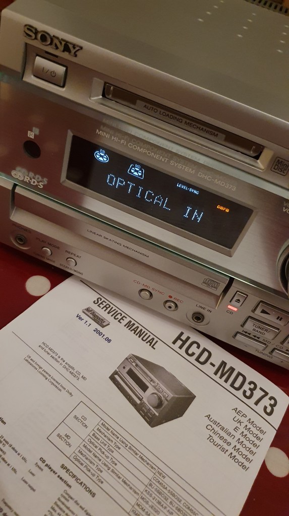 Eventually I bought a unit for £41, fully working but no remote control (no biggy as I have one already from my original system). It arrived, I unpacked it (wiped it down with anti-bacterial/anti-septic wipes!) and took it apart to check for signs of wear or problems. It all checked out OK and with the help of the official Sony service manual I was able to put it into “service mode” and read the error logs and check total play/record times (total record time for the MD is significant as it uses a high-power/high-temperature laser mode to record with only a finite lifetime) – all looked good.