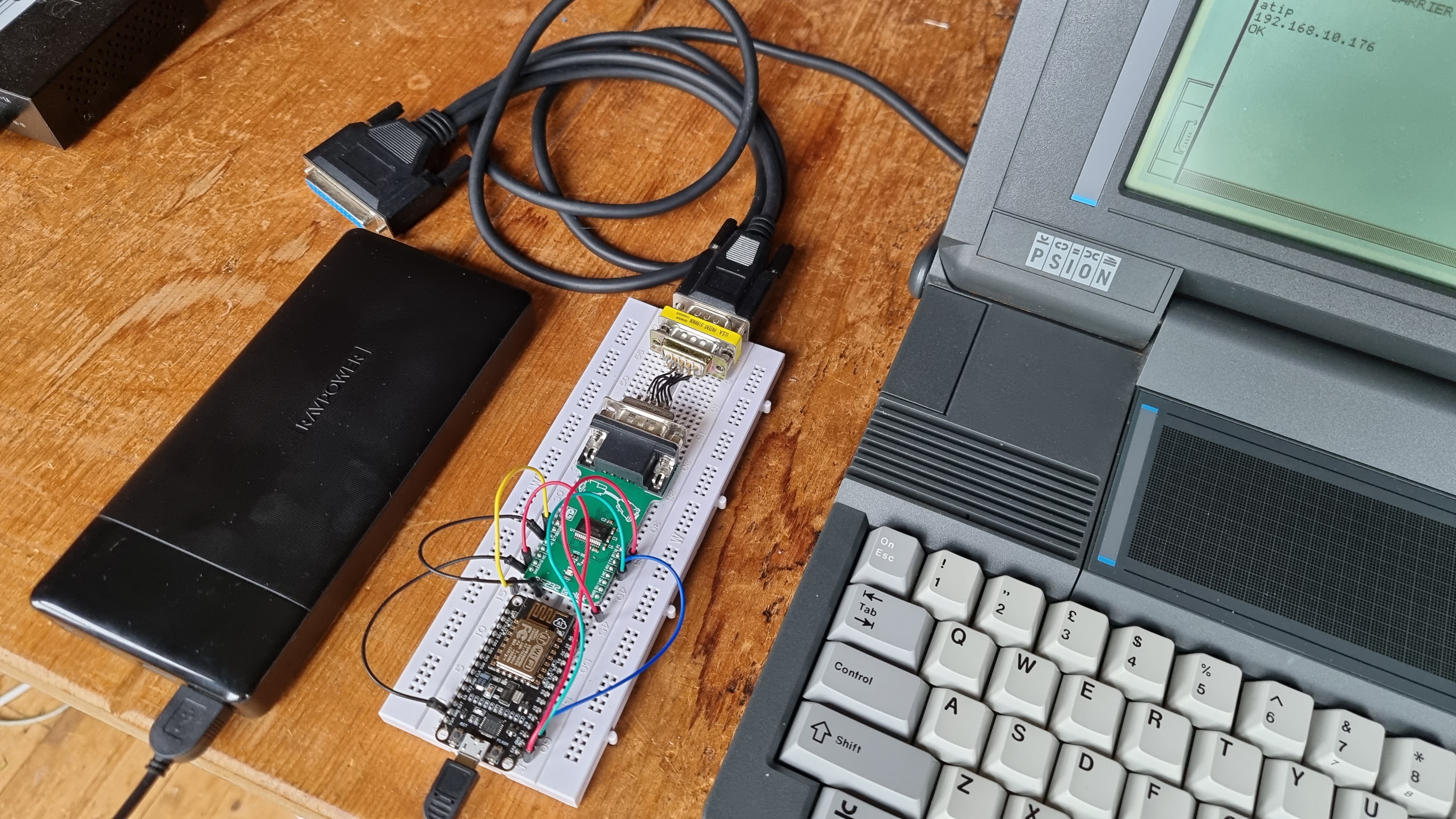 For the physical connection to the Psion serial cable you’ll need an RS232/TTL converter – this converts the voltages of the RS232 protocol to the logic levels that the NodeMCU can use. You’ll probably need some sort of null modem and/or gender-changer connector too. (All of this serial RS232 stuff is 1960s-era tech – DTE vs. DCE etc.)