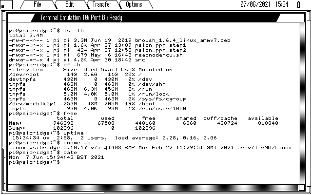 The PsiMail suite assumes that the Psion is connected to some sort of dial up modem via the 3Link serial lead. I’ll be substituting the modem for a Raspberry Pi with USB/Serial converter running pppd. The DQYDJ guide lists what you need to do to strip away most of the commands that deal with actually dialling and leave just the commands that start the ppp link. Setting up pppd on the Raspberry Pi is also covered, so I won’t repeat that here.