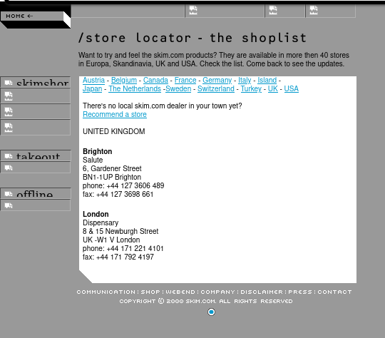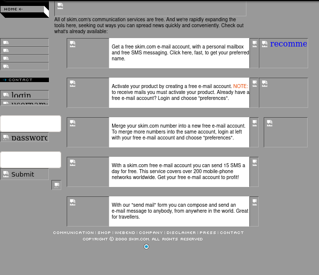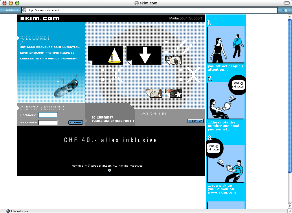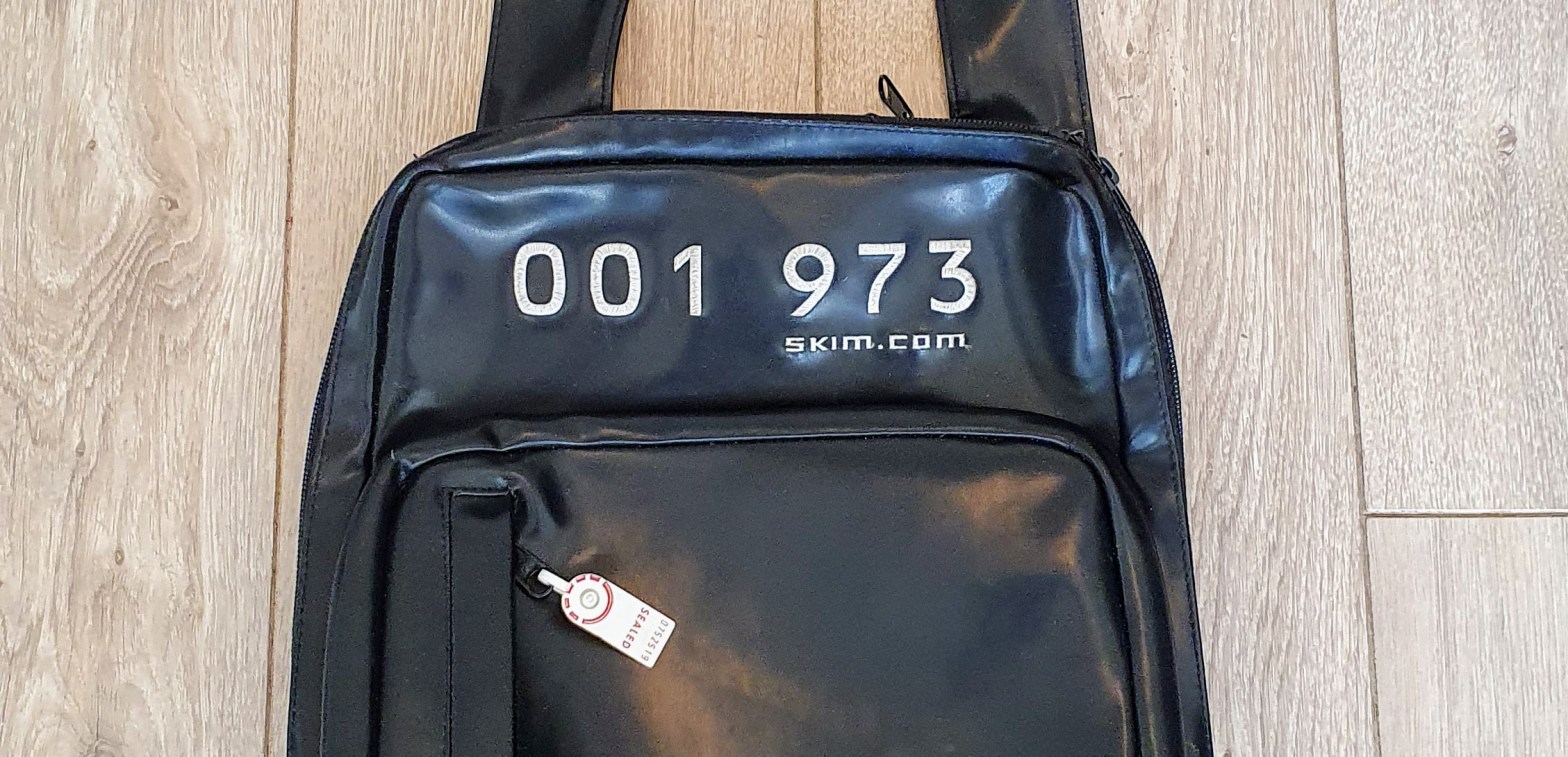 skim.com was a Swiss Internet start up (including the Freitag founders apparently) and a band of fashion designers that had the idea of creating cool clothing products & accessories with unique IDs on them that translated into personal email addresses used by the wearer. At the time I registered this (bag) product and had the address “001973@skim.com”. Sadly now defunct but a fascinating piece of internet/dot-com era history. I suppose I should really use the bag to carry my retro Psion laptop (and all the accessories needed to make it actually useful in the modern age).