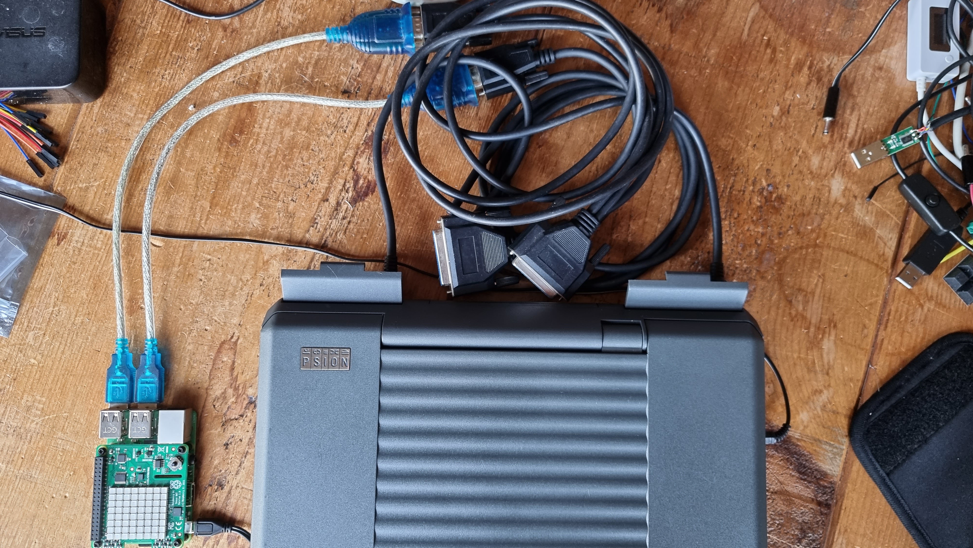 This setup worked really well, but using the standard Psion serial cable and USB/Serial adapters means a lot of spare, coiled up cable and this spoiled the vibe for me: imagine sitting in a coffee shop, sipping on a latte and then pulling out your uber-retro laptop with a few feet of extra cable coiled up in a heap on the table, not cool!