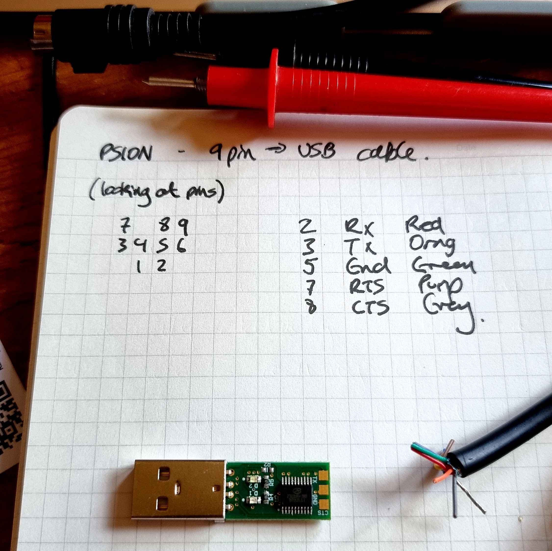 …but only the serial terminal connection worked – the Link software failed to achieve a connection (even after wiring DCD/DTR/DSR together at the Psion end). The Psion MCLINK/RCOM/PSIWIN protocol obviously needs full hardware flow-control including DCD/DTR/DSR which the FTDI USB/RS232 adapters don’t provide access to, but obviously the Prolific PL2303 converters I’d originally used do.