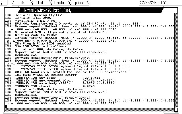 For the Link software I’d installed dosbox-x and created a simple shell script “mclink.sh” to run the Psion MCLINK.EXE program headless (i.e. with no display) so I could run it from the text-only terminal. MCLINK.EXE is an old DOS program so it’s relatively easy for the ARM-based Pi (model 3 B+) to emulate and successfully run using the x86 DOS emulator. I’d configured dosbox-x’s emulated COM1 port to connect to /dev/ttyUSB1 and /home/pi/mc400 to be mounted as C:\