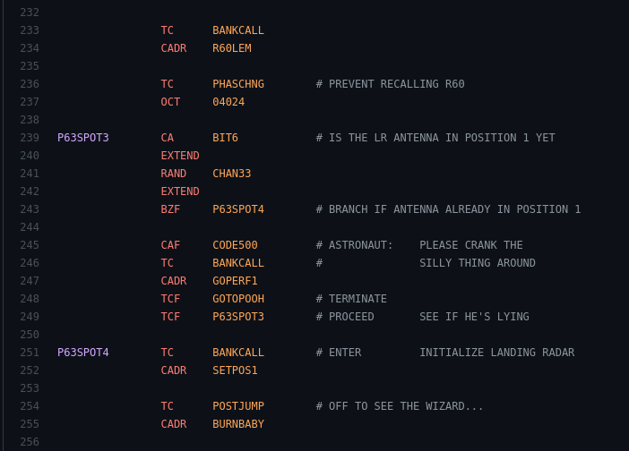 NASA’s code for the Apollo Guidance Computer (AGC) used in the Lunar Module (LM) has a wealth of humorous & sarcastic comments and some apt procedure names like “BURN-BABY-BURN–MASTER_IGNITION_ROUTINE” ๐