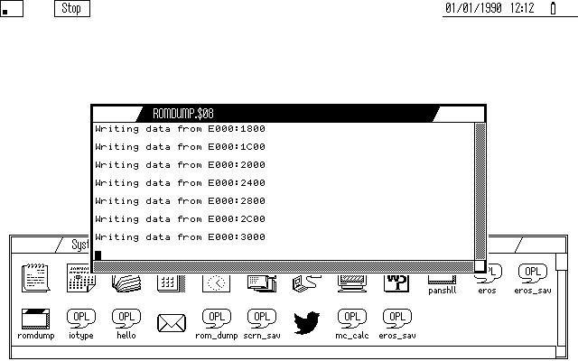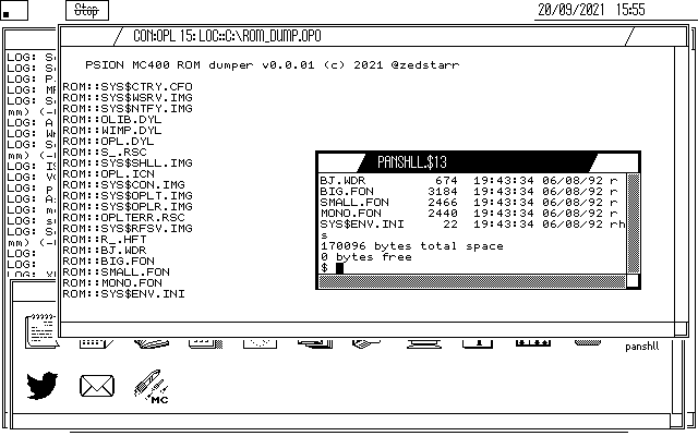 Meanwhile, back on the MC400 some simple OPL code (or even using Psion’s own “PANSHLL” shell) can list & copy the MC400’s ROM disk contents, so getting the actual files is fairly trivial.