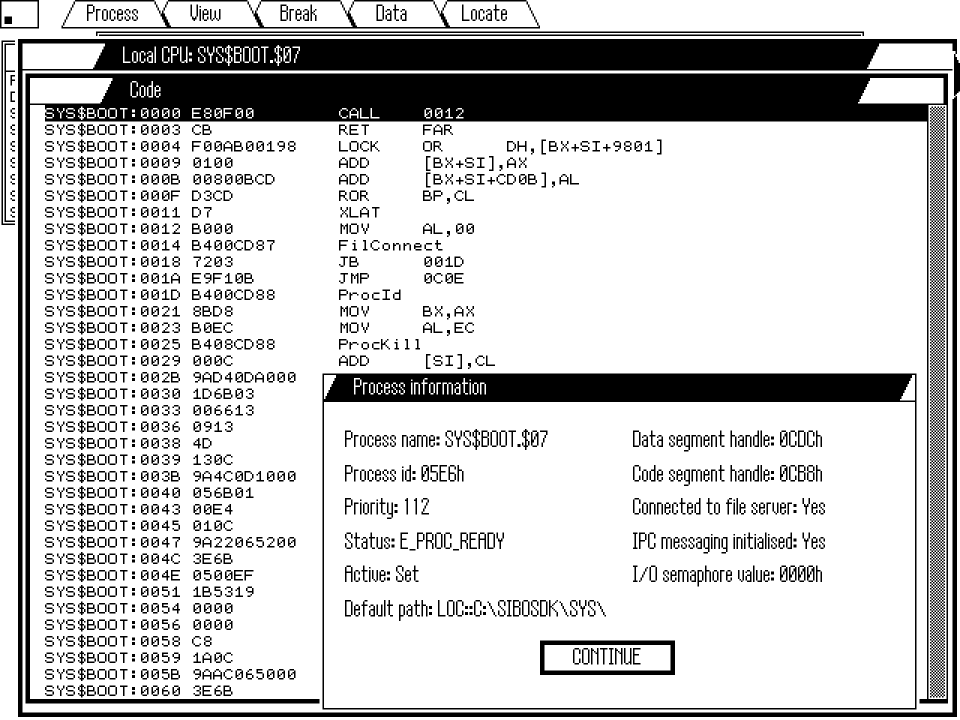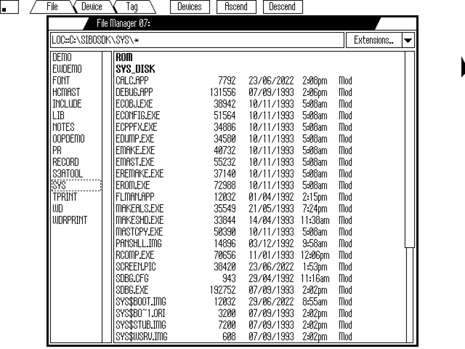 I’m assuming that SDBG.EXE has been written with modified file & window servers (SYS$FSRV and SYS$WSRV) to run on “PC” hardware rather than the SIBO MC and that all the good stuff (ASIC1/2 + ASIC4/5 support) is missing from this code. It would be interesting to see if the shell (SYS$SHLL) from the MC can be swapped into the embedded “ROM” image in SDBG.EXE and actually run.