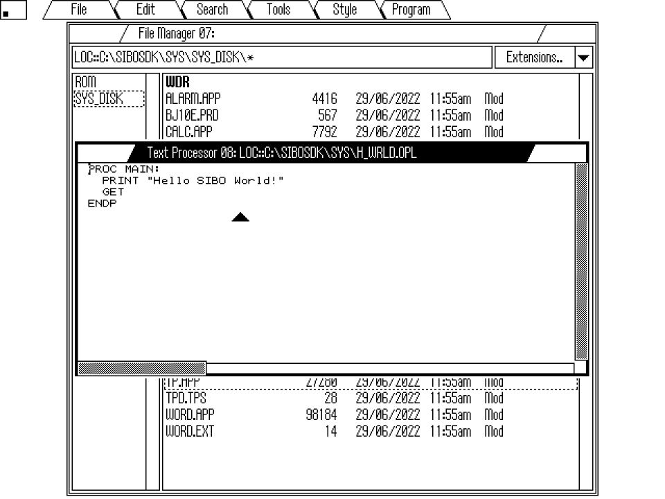 Whilst poking around in the Psion SIBO SDK debugger (the DOS prog “SDBG.EXE” which appears to be heavily based on the MC400 OS/GUI and is found in the SYS directory after installing the SIBO C SDK) I’ve managed to get some of the MC’s “native apps” running in it 😀