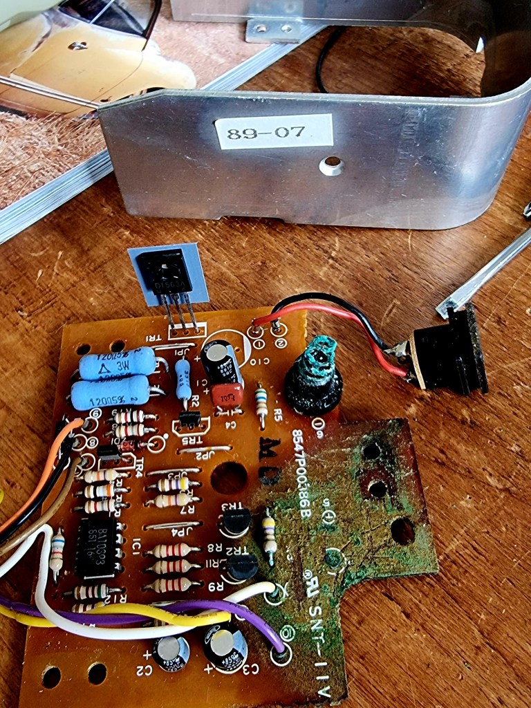 The phone’s charging station had the spare battery left in it where it had leaked and corroded the contacts and PCB. The build date (89-07 i.e. July 1989) sticker is visible on the heatsink.