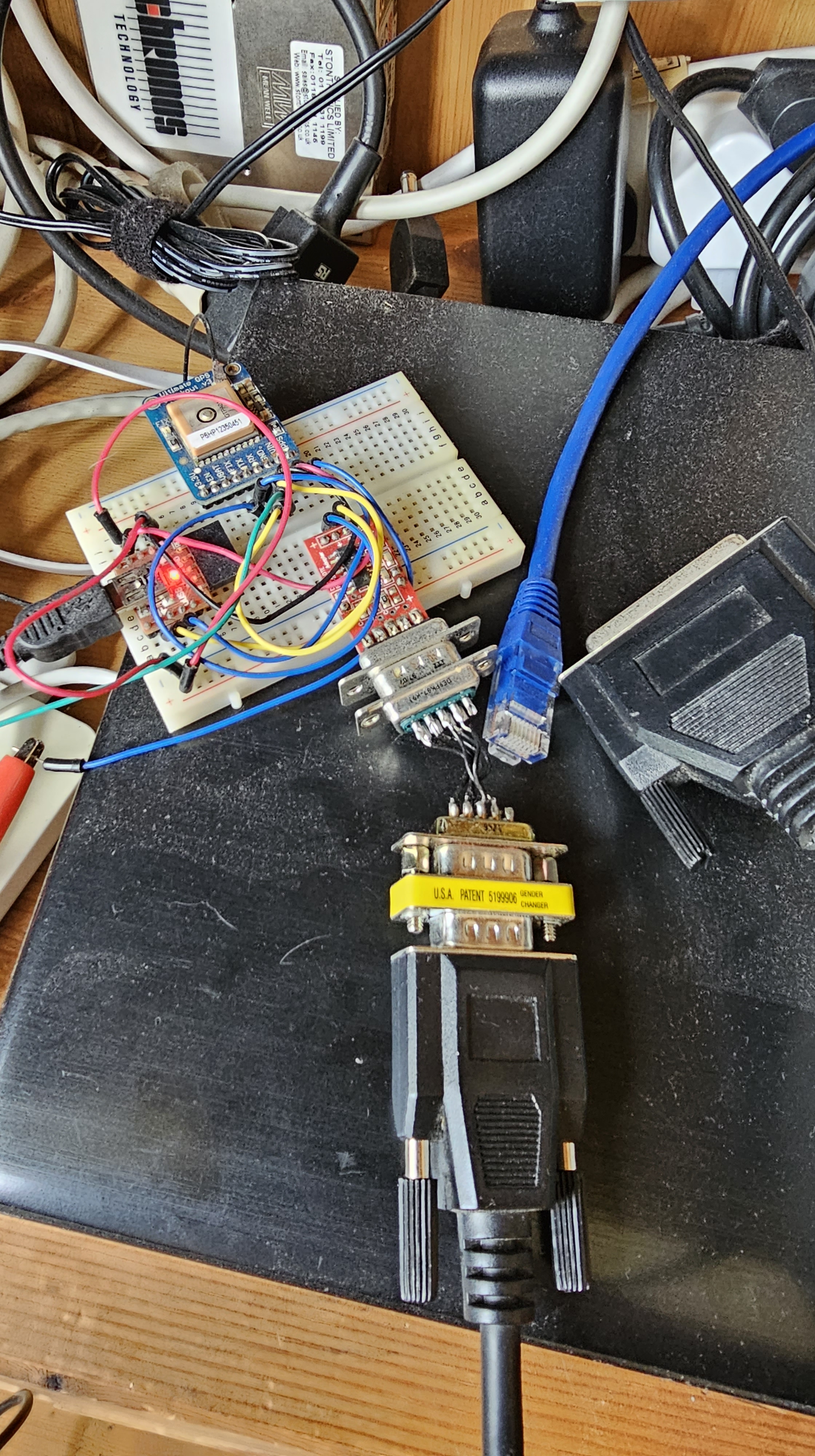 The GPS receiver I used was connected via breadboard and a TTL/RS232 UART module + null modem/gender-changer to the Psion 3Link cable.