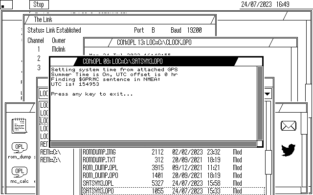 The OPL code is on github but beware – it’s not polished (and only the time is set, not the date) – use at your own risk. Psion time is sync’d to UTC/GPSTime within a second or less.