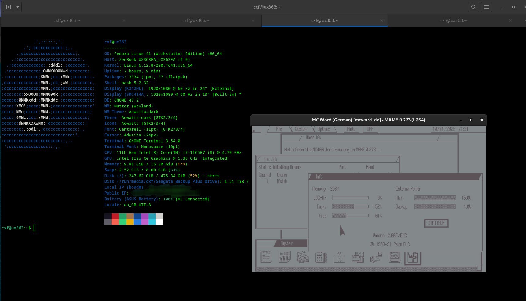 So, a few years after my initial post https://zedstarr.com/2021/12/08/emulating-the-psion-mc400/ contemplating the feasibility of emulating the Psion MC400 laptop from 1989 – the latest MAME release 0.273 (31/12/2024) finally contains (multiple versions of ) the MC400 (and MC200 too) as some of the (now many!) Psion machines that are supported under the MAME hardware emulation framework 😉