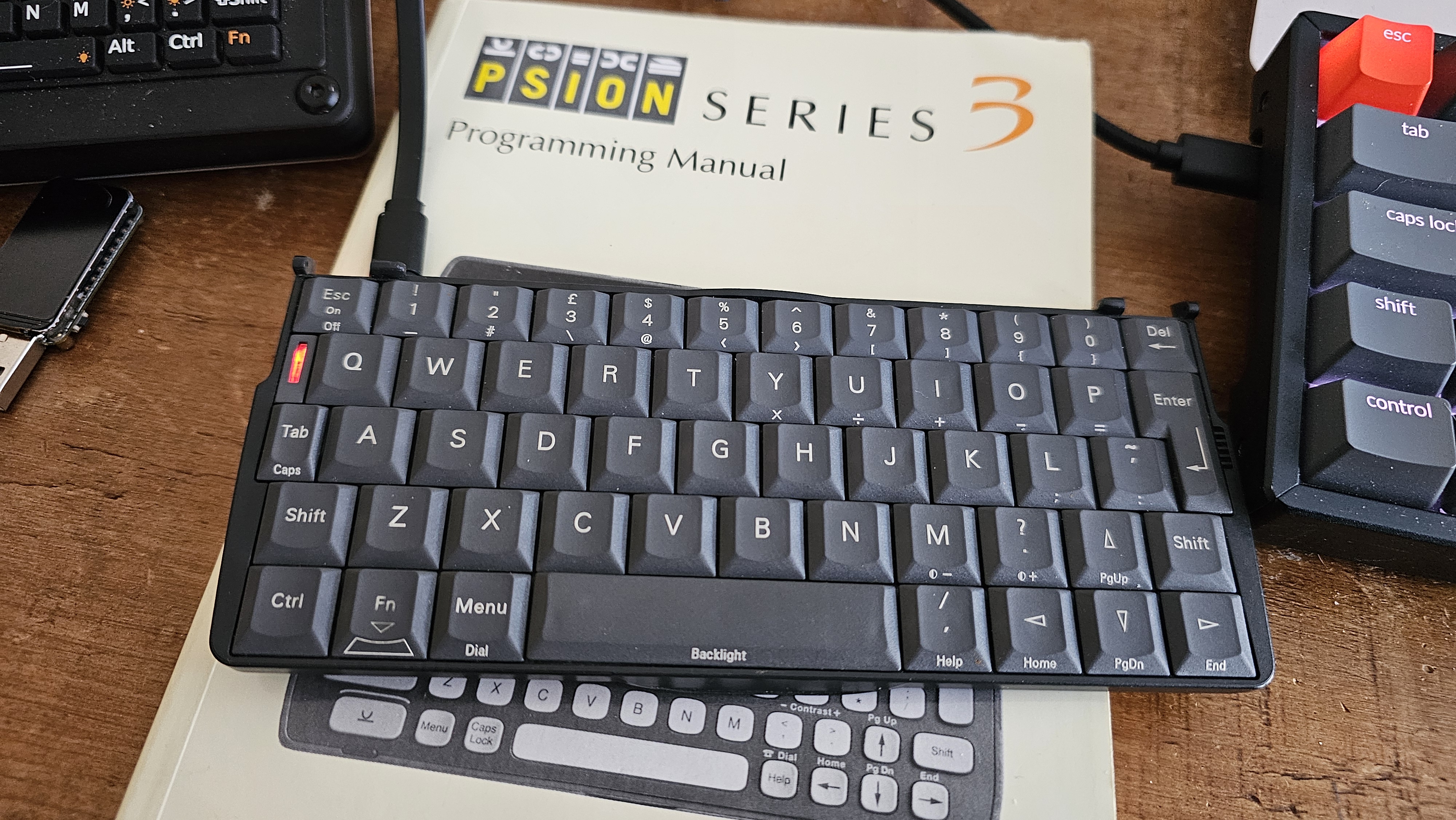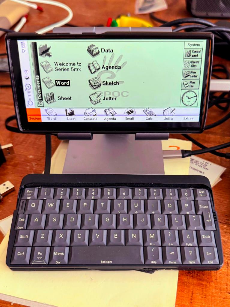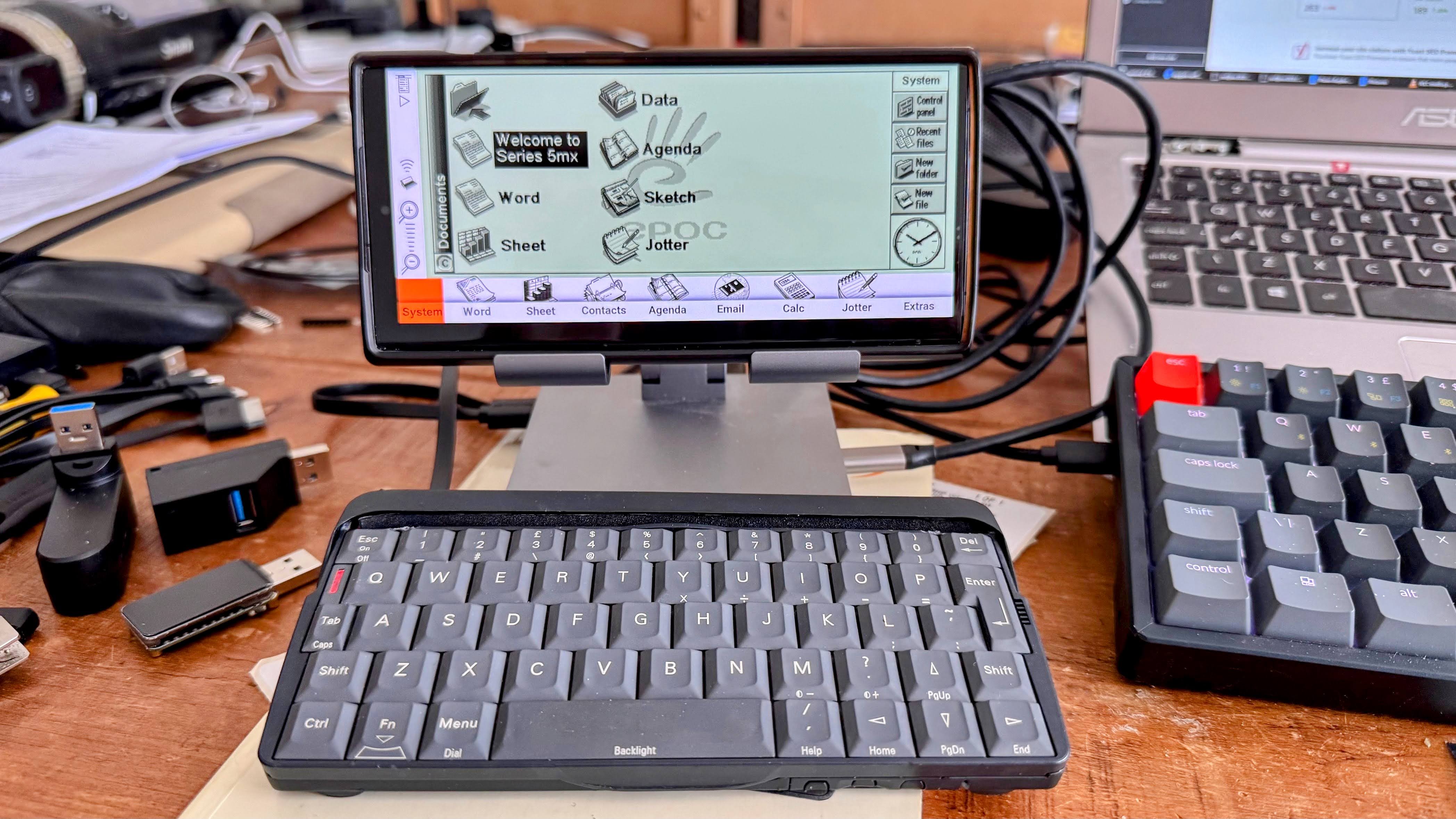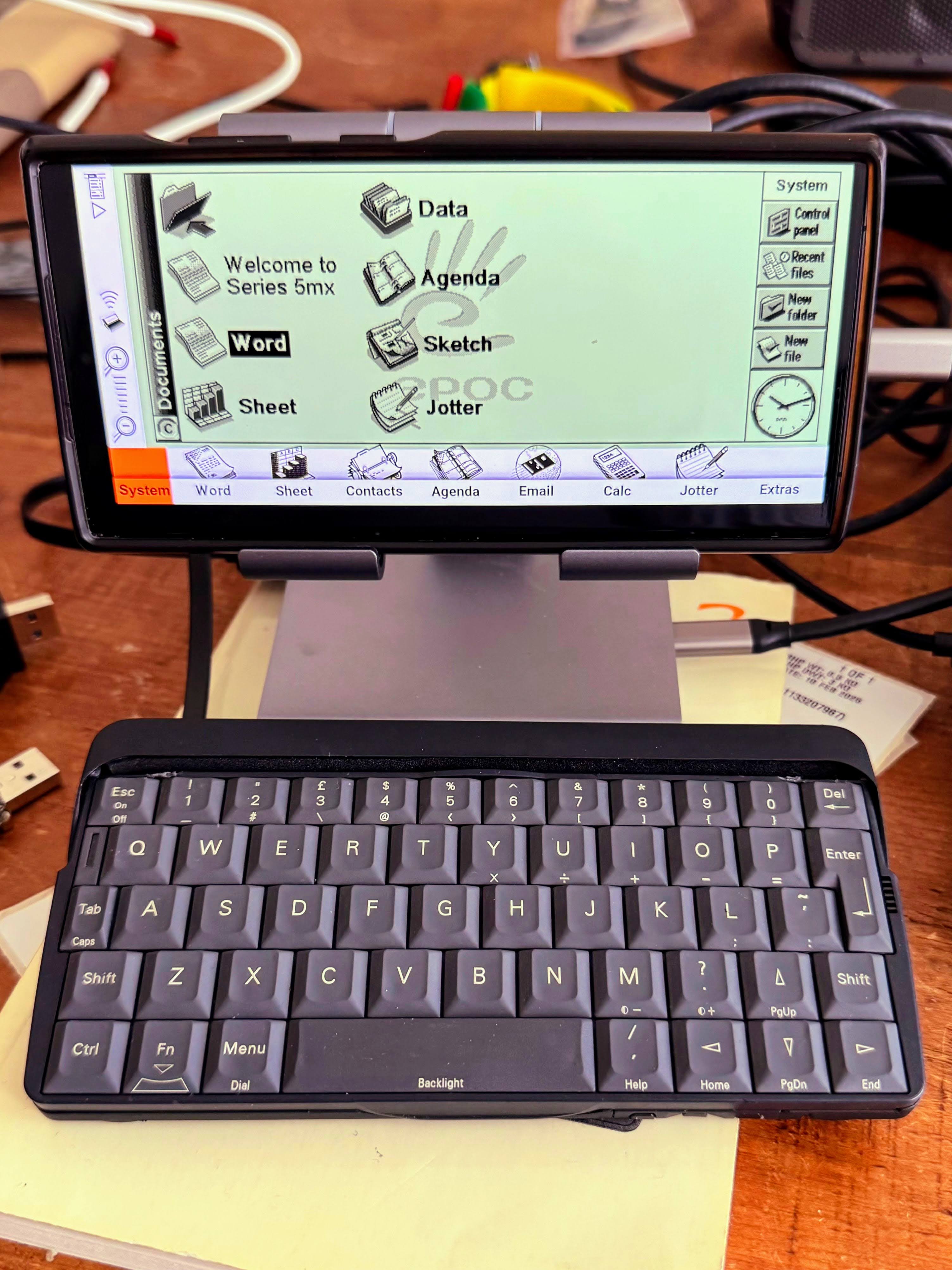 This is just the Psion-USB keyboard plugged into an iPad holder/USB hub plugged into my Android phone running the wuffs.org 5mx emulator…
