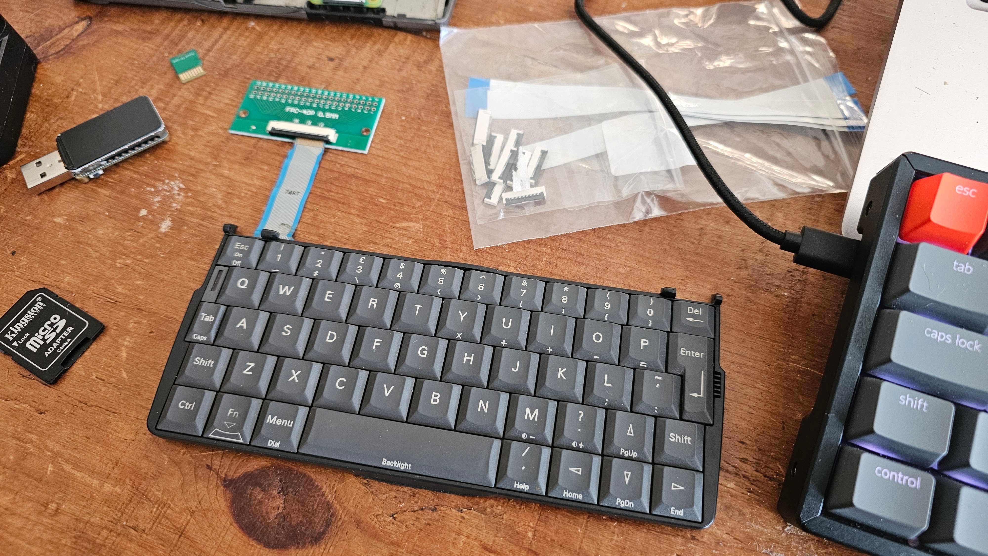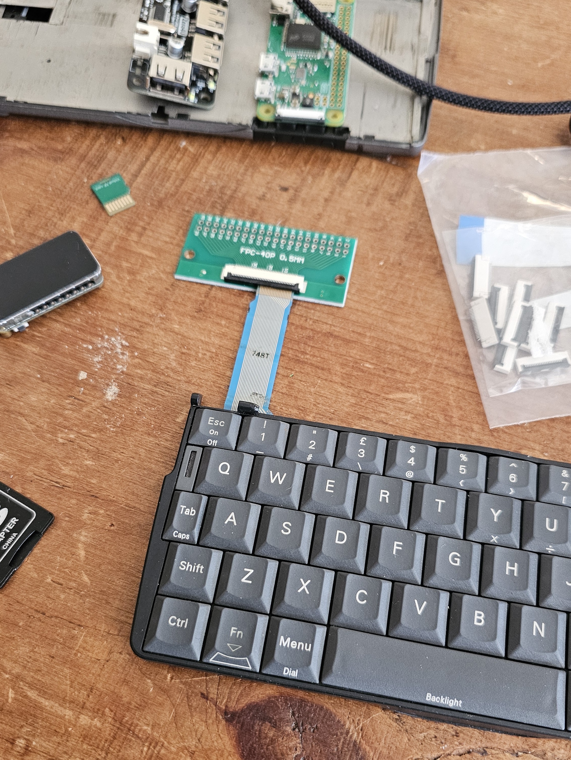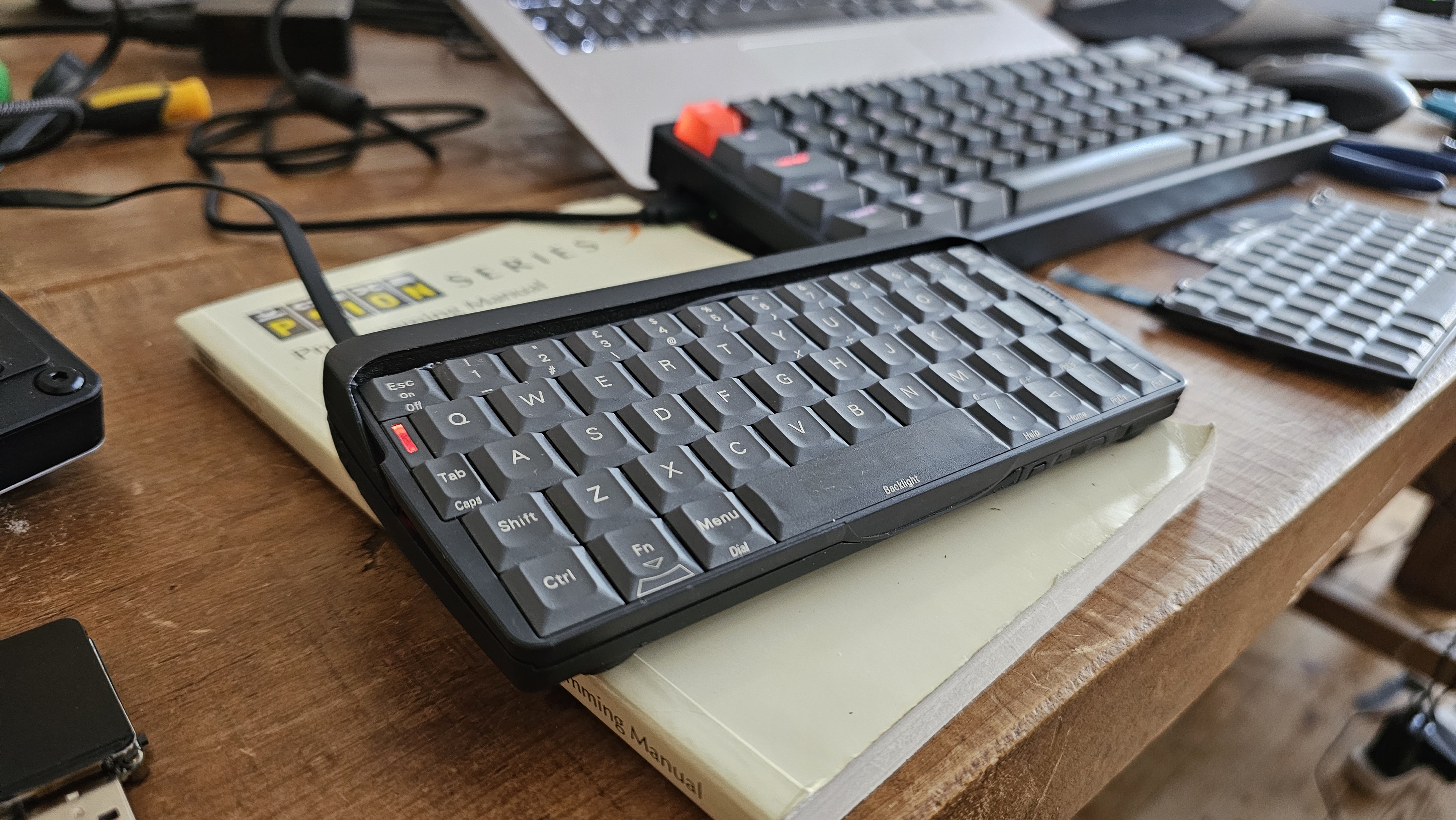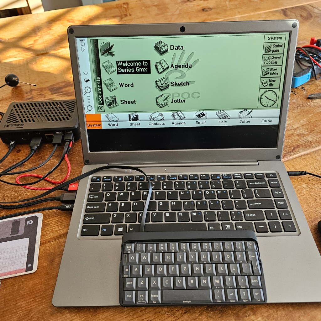 This is just the Psion-USB keyboard plugged into an iPad holder/USB hub plugged into my Android phone running the wuffs.org 5mx emulator…