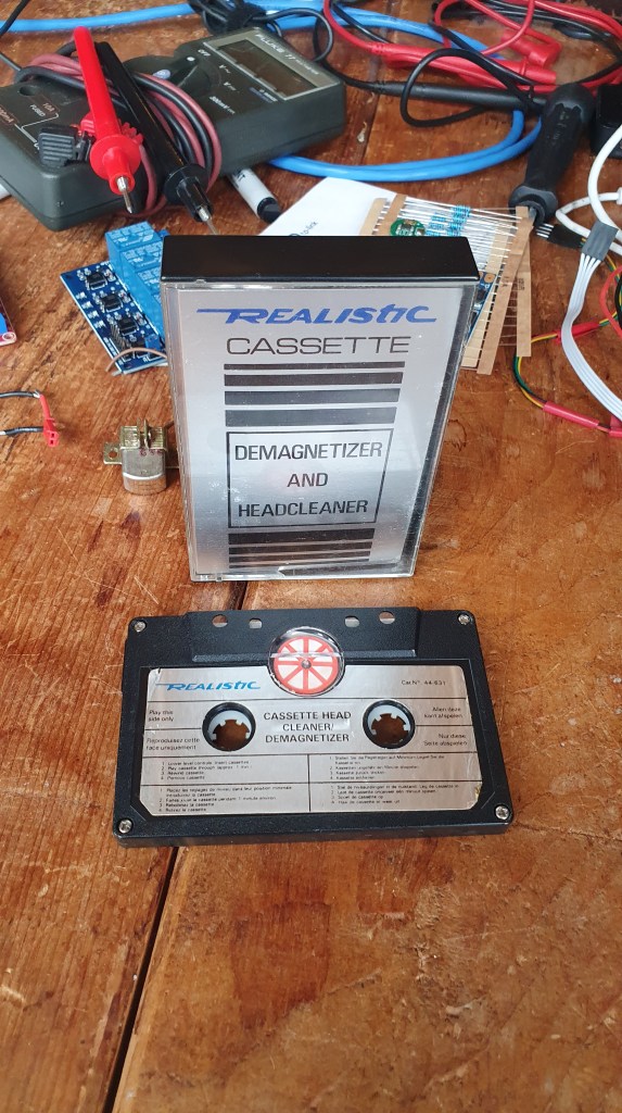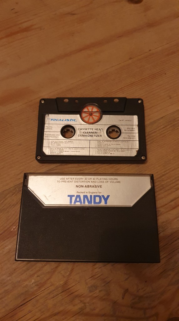 Another Tandy/Radio Shack/Realistic gem from around the same era – the cassette tape head-cleaner & de-magnetizer[sic] – a fibrous material tape instead of the usual magnetically coated polyester-type plastic film (magnetic tape) and a wheel with a magnet (the white/red circle that can be seen through the clear plastic window in the cassette case) that is driven by the tape – on FF/REW the white/red wheel would rotate (in theory fast enough) to act as a de-gaussing field generator for the cassette player’s playback head.