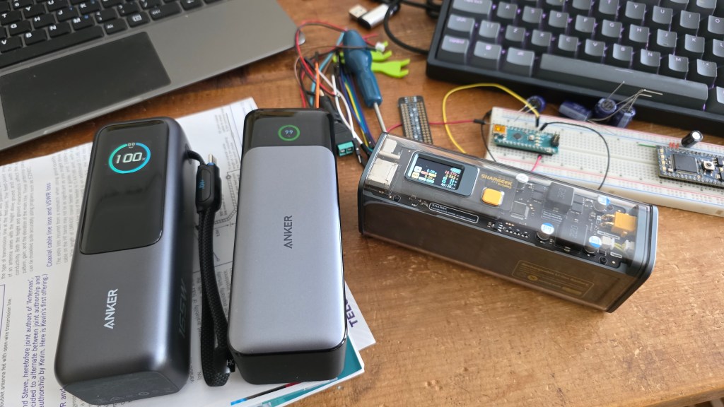 The memory of the Tandy battery club came to me the other day as I was contemplating these 3 power banks sitting on my workbench, each one has around 90Wh of energy and I started thinking about the free AA cells from Tandy, each one with probably 2Wh of energy at best…