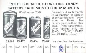 Growing up as a geeky teenager in the 1980s I fondly remember the “Tandy Battery club” from that era – a loss-leader from the Tandy (UK) or Radio Shack (US) chain that allowed customers to claim 1 free red “Radio Shack” branded battery every month. Obviously hoping that once in the store you would be tempted to buy something else… the free batteries were just standard zinc-carbon types, nothing fancy, but most of my battery operated kit back then (Walkmans, condenser mics, ghetto blasters) were powered at some time or other thanks to Tandy’s marketing budget ๐