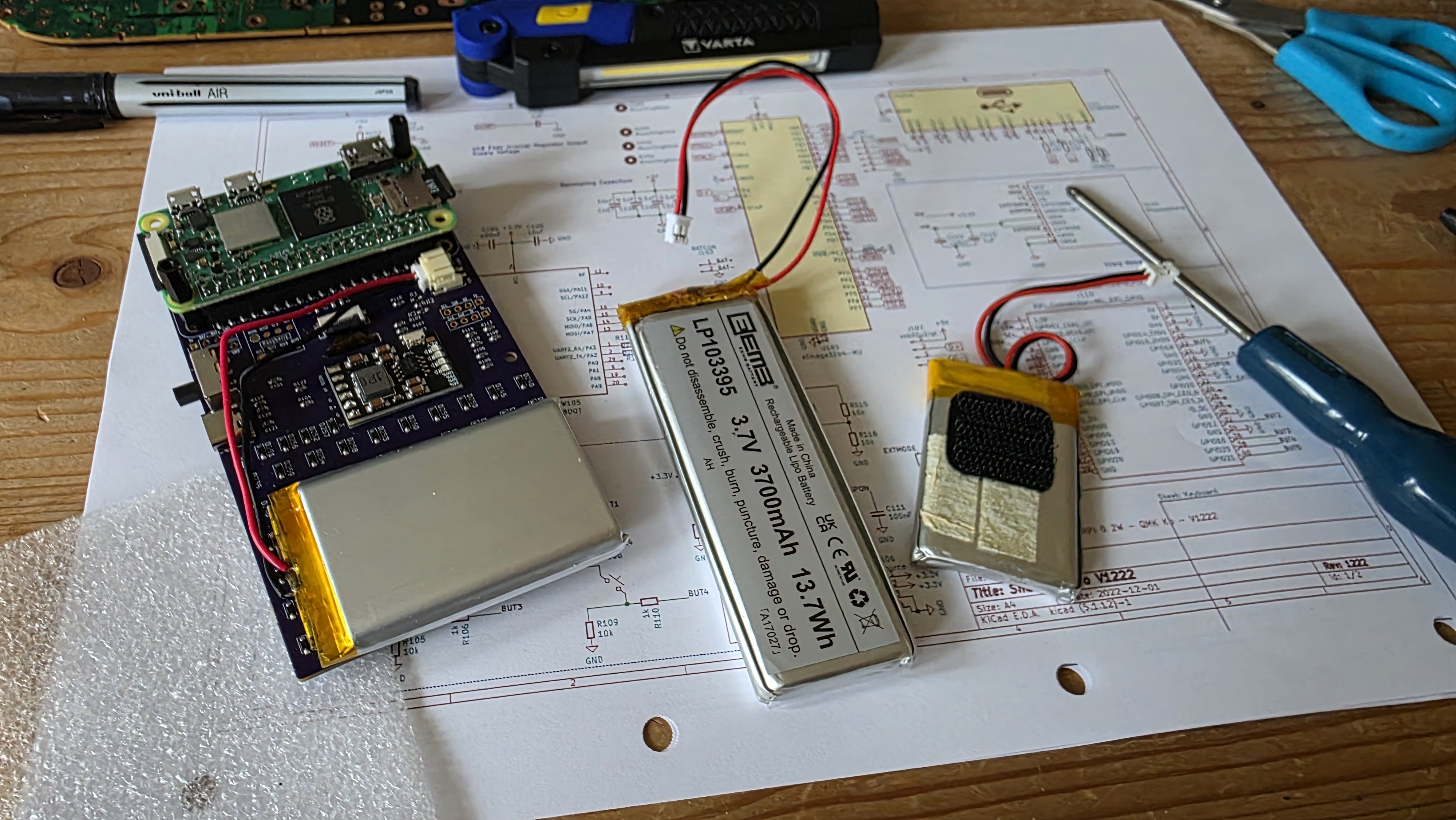 Excitement quickly evaporated though when I tried to get it up & running; plugging in a LiPo battery and a Pi Zero it quickly became apparent that there was no power to the Pi ;-( The photos on the Crowd Supply and Hackster.io pages showed the Pi Zero with a standard header plugged component-side down to the SharPiKeebo’s PCB but it quickly became clear that the orientation had to be reversed – unusually the Pi needed a header that was soldered to the underneath of its PCB… so, new (bare) Pi was ordered and out came the soldering iron…