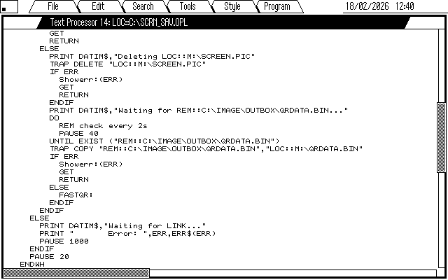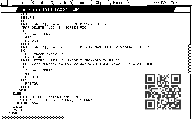 In all its glory – below is the OPL on the MC that detects a screenshot has been created (Ctrl-Psion-Shift-S on the Psion) then copies it to the Pi for conversion to PNG, syncing to Gdrive, then waits for QRDATA.BIN to be generated and opens/prints the QR data/code ๐